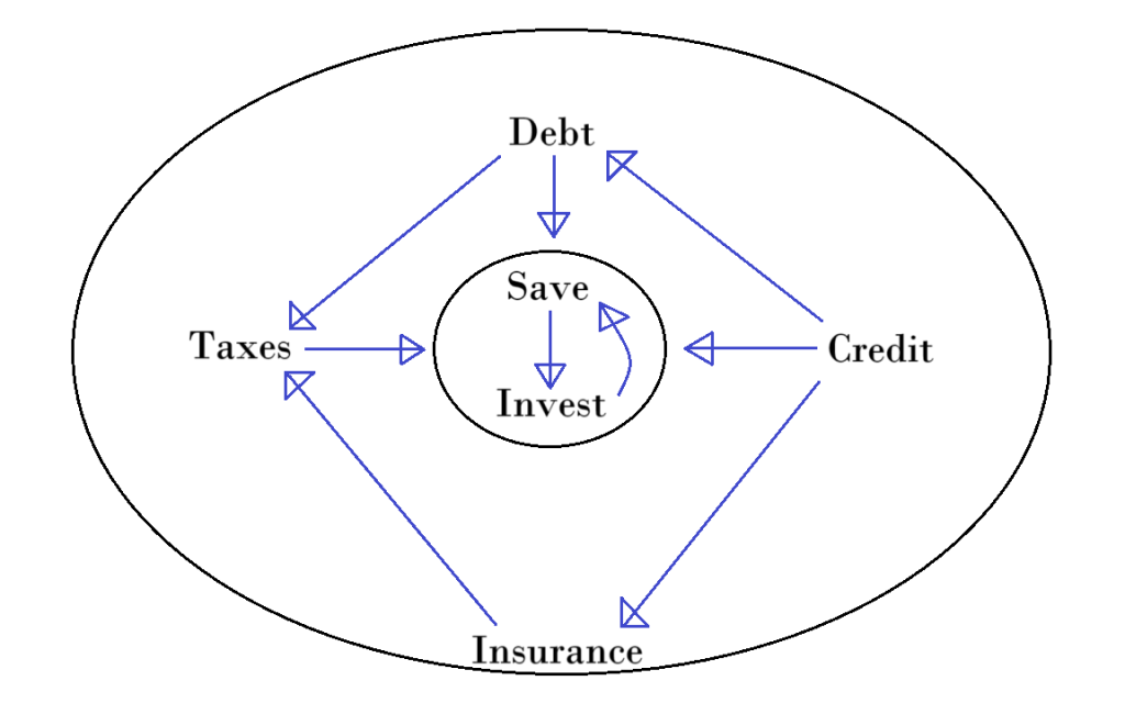 Start at the center. Saving and investing are at the core of the plan because they’re where financial success begins. You have to find a way to save some money, some way, somehow, possibly with the help of budgeting, and/or finding ways to make more money.