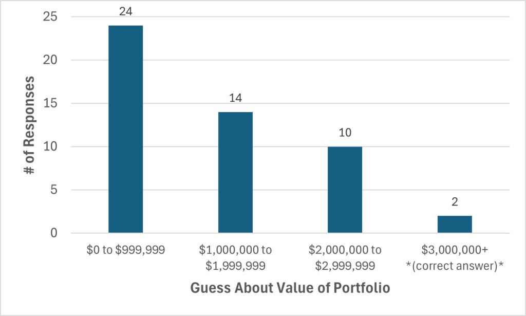 I was surprised that 96% (48 out of 50) underestimated the power of compounding. 96%! The average guess was just over a third of the correct amount, helped by the two high guesses of $5 million. The middle and most common guesses were less than a third of the right answer. The bias turned out to be larger than I ever would have expected. Now we know.